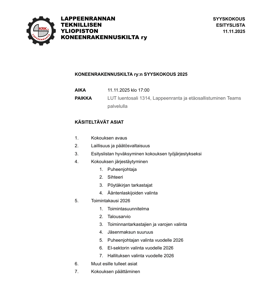 Kokous järjestetään luokkatilassa 1314, mutta osallistuminen on mahdollista myös teamsin välityksellä. Jos tarvitset etäyhteyksiä, niin ilmoitathan asiasta puheenjohtajalle telegrammissa @Samppa50 viimestään 11.11.2025 klo 13.00!